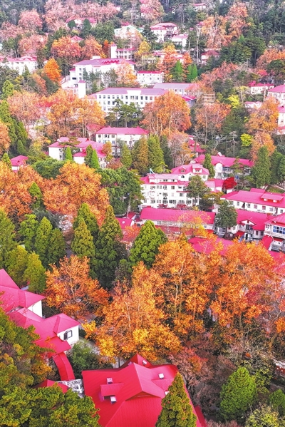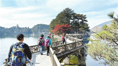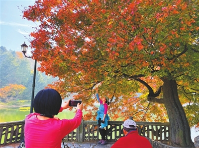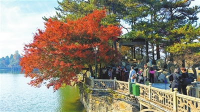 初冬时节,庐山风景区如琴湖畔层林尽染,湖心岛上火红的枫叶吸引了众多游客前来参观,令人流连忘返。(本报记者 程鹏 摄)