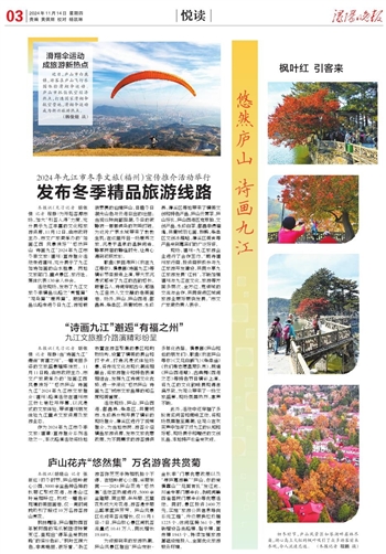 本报讯(见习记者 胡依倩 记者 程静)为开拓客源市场,加大“引客入浔”力度,充分展示九江丰富的文化和旅游资源,11月12日,由市政府主办、市文广旅局承办的“如画江西 风景独好”“悠然庐山 诗画九江”2024年九江市冬季文旅(福州)宣传推介活动走进福州,充分展示了九江如诗如画的山水胜景。两地文旅部门、重点景区、旅行社、媒体代表130余人参会。