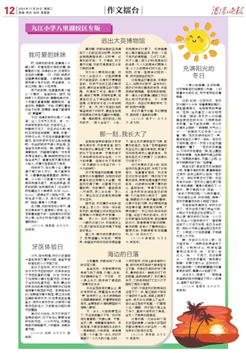 不一会儿,太阳就要落山了,天空渐渐暗淡下来。“我们去海边看看吧!”我提议道。于是,全家人便一起朝着海滩走去。来到海滩,只感觉海滩和泳池的水一样暖暖的,沙质很细。弟弟提议搭一个沙堡,好一会儿,我们才搭起了一个大大的沙堆,这时,一个浪花拍来,我冲上前去保护沙堆,刚好被浪花拍到大腿有些站立不稳。我急忙扎起马步定了身形,清凉的海水一瞬间没过了我的膝盖,但很快就退了,我仍意犹未尽,又被海浪拍打了五六次才回到了岸边沙堆旁。