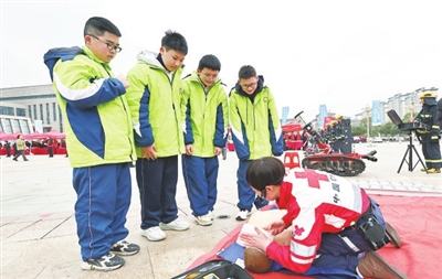 3月5日,我市2025年科普之春暨“学雷锋 文明实践我行动”主场活动在彭泽县民生广场启动。这是活动当天志愿者在为学生科普急救知识。