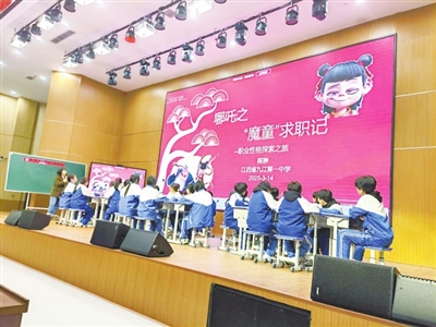 紧接着,九江一中陈翀老师带来《哪吒之“魔童”求职记》。陈老师巧妙融合热门IP与MBTI性格分析,带领八年级学生解析自身性格类型,并通过模拟招聘会,探寻性格与职业的适配方向。课堂上,欢声笑语与深刻思考交织。一名学生分享道:“我热爱绘画,梦想成为城市规划师。性格测试显示我偏内向,但陈老师说职业与性格的匹配是动态的,这让我明白,即便当下性格与职业方向不符,也能通过学习与调整去实现梦想。”