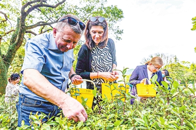 近日,庐山市茶叶科学研究所内,一批来自德国的游客在茶园体验春茶采摘。庐山市近年来通过加强国际交流,持续释放发展新动能,加速激发外向型经济的强劲活力。
