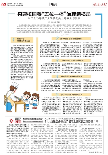 从智慧监管屏跳动的数据流,到家长陪餐桌的建议本;从学校食堂后厨忙碌有序的身影,到孩子餐盘里营养可口的佳肴;从用心配比的丰富菜系,到显著增长的就餐学生人数和他们脸上的满意表情……2024年以来,在九江市委、市政府、市纪委市监委的高度重视下,九江市教育局联动有关部门,围绕“阳光、安全、可口、营养、优质”的总目标开展校园餐整治,聚焦全市中小学校园食品安全和膳食经费管理突出问题,积极构建采购、管理、监督、服务、评价等“五位一体”校园餐治理格局,推动校园餐实现“从吃得安全到吃得营养、从规范管理到优化服务、从问题整改到源头治理”三个根本转变,为学生健康成长提供坚实保障。