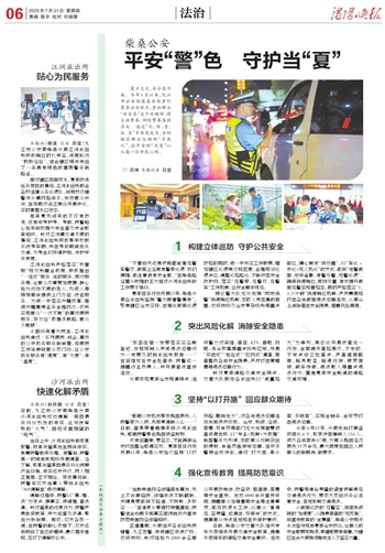 从街面巡防的“见警率”,到案件侦破的“加速度”;从隐患排查的“无死角”,到宣传教育的“全覆盖”,柴桑公安用汗水与坚守筑牢夏季治安防线,让群众的安全感更可持续,幸福感更有保障,为辖区社会大局持续稳定注入了坚实力量。