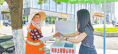 本报讯(记者 陈沽玥 文/摄)7月底的九江骄阳似火,一位在绿地ICC附近清扫街道的环卫工走到街边的一个小冰箱旁,随手拿出一瓶冰水,喝了两口之后舒畅地喘了一口气。