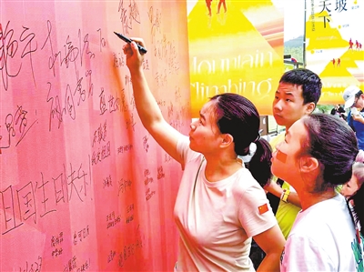 此次登山活动恰逢国庆来临,主办方为每一名登山爱好者发放了一张国旗贴纸,并设8名国旗手领队,烘托现场气氛。在好汉坡登山起点,漫天的红旗迎风招展,人们在脸部贴上红旗贴纸,一起走到“祖国祝福墙”,写下最真挚的祝福,有的祝福“祖国繁荣昌盛”,有的留下“祖国生日快乐”,有的写“爱我中华”,有的祈福“国泰民安”……将所有美好心愿刻进匡庐的山水之中。出发前,全体登山爱好者齐声高歌《歌唱祖国》,抒发对祖国母亲的崇高敬意。