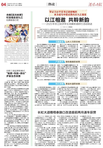 10月10日至12日,来自上海、江苏、浙江等长江经济带沿线省市的50余位媒体代表齐聚九江,开展以“高质量发展、高水平保护”为主题的调研行活动,本次活动由江西省报业协会、中共九江市委宣传部主办,九江市融媒体中心等承办。调研团深入探访长江国家文化公园、港口码头、工业企业,全方位触摸高质量发展的九江脉动。