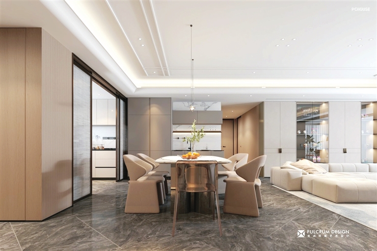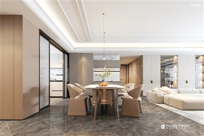 本案为意式轻奢风格,设计师大量采用原木、留白的处理手法,隐藏关于设计痕迹,用材质与肌理为空间刻下时光的印记,营造整体雅致的度假氛围。