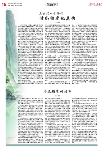 这就是一九八四。一个生活在城区的中学生所看到的时尚急流。在这之外,其实生活像大河缓慢地抹过宽阔的河滩。除了戴上海牌腕表,去影院通宵电影,逃票乘火车外出,逃学看模糊不清港台录像,听《隋唐演义》以外,平常中有着不平常。衣裤的补丁作为一种恒久的风尚,在一九八四年意外地终结,好像一条河流遇上沙漠。凡里丁、卡其布以后,的确良一统天下。的确良是的确凉快,熨斗压出的裤线像似金刚煅就的刀锋。大人们中山装或工作服,我们搞不明白名称的含义,总之里面的兜现在开始拿到外面,领子用挂钩挂上,煞是庄重。那时,整个生存空间都混合着草木的香气和焦煤燃烧后稍有刺鼻的化学气味。在工农兵粮站凭证排队买米打油,费力地把米面放在自行车后座上。