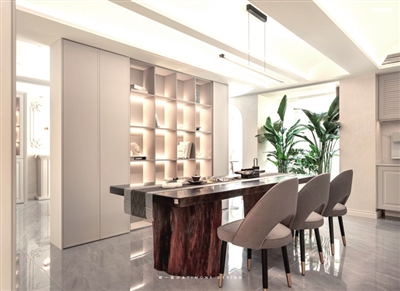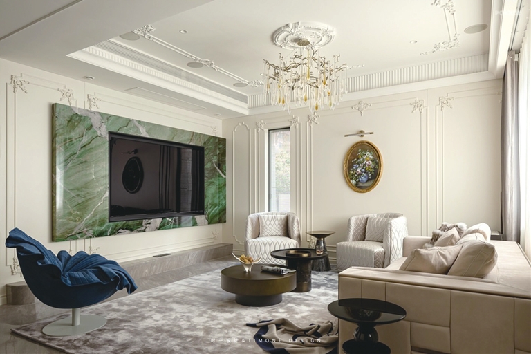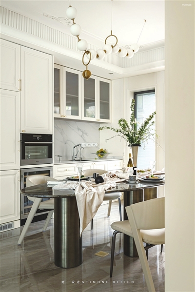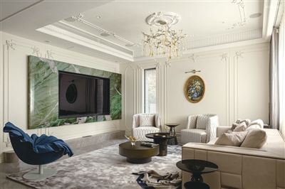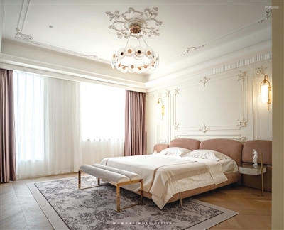 本案为法式轻奢风格,全房设计选择融合中国花鸟蔓藤等元素的“洛可可主题线条”,整体布局不拘于经典摆位,交互与弧形穿插之间,灵动又前卫。墙板的线条元素,选择了古典的对称设计。