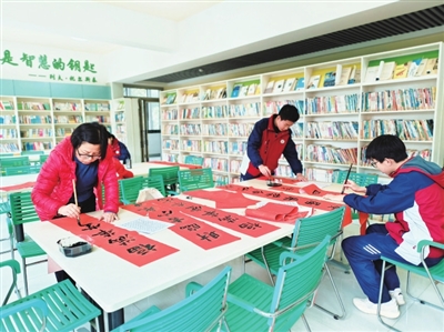 墨香四溢,红纸翻飞。师生们笔意洒脱,墨韵酣畅,一副副吉祥喜庆的大红春联挥洒而出,一张张遒劲有力的“福”字跃然纸上。师生同执笔,一起挥毫书锦绣;“悦生”亦“悦师”,一起奋笔绘未来。