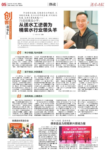 他出生贫寒,又年少失怙,初中毕业后参军入伍。退伍后,辗转各大城市打工创业,尝尽人间冷暖;2010年,进入桶装水行业,从送水工开始起步,用15年奋斗,逆天改命,成长为九江桶装水行业领头羊。如今,不仅拥有自己的公司,还发展了11家加盟店,被圈内人士尊称为“水龙王”。他,就是来自九江创客协会的优秀代表、九江市华福万家商贸有限公司总经理龙小平。