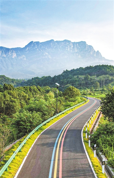 7月16日,环庐山旅游公路——彩虹路宛如色彩斑斓的丝带飘落在庐山脚下。红黄蓝三种鲜艳的颜色交织在一起,随意却又和谐地铺展在大地上,蜿蜒向前伸展,将不同的景点串联在一起。