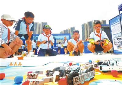 “孩子们可以参与动手编程,进行组装,锻炼自己创新创意思维和动手动脑的能力,是一款非常受学生欢迎的机器人装备。”在九江市人工智能科创基地展位前,多款拼装的ukit机器人被孩子们团团围住,来自柴桑区第四小学六年级学生徐东伟不一会儿就熟练地利用遥控,操作机器人搬运小球,引得其他的孩子跃跃欲试。他说:“现在科技越来越发达,我们要好好学习科学知识,拥抱科技生活的美好未来。”